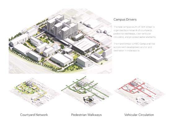 At the heart of the IU Health District, a state-of-the-art medical center will serve as a flagship facility, offering comprehensive healthcare services, advanced treatments, and groundbreaking medical research. The district will incorporate a holistic approach to wellness, featuring green spaces, recreational areas, and walkable pathways, promoting physical activity and a healthy lifestyle. Public art installations, cultural venues, and community gathering spaces will create a vibrant and inclusive environment that engages both residents and visitors. Senate Ave intends to be vacated as part of a campus green and pickup/dropoff.